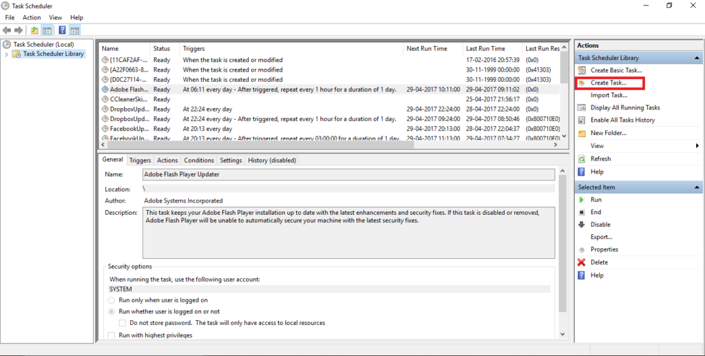 • Once the Task Scheduler opens, click on Create Task... in the Actions Menu on the right.
