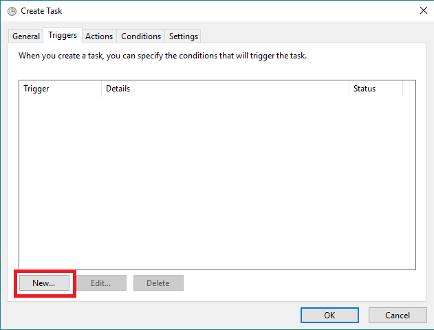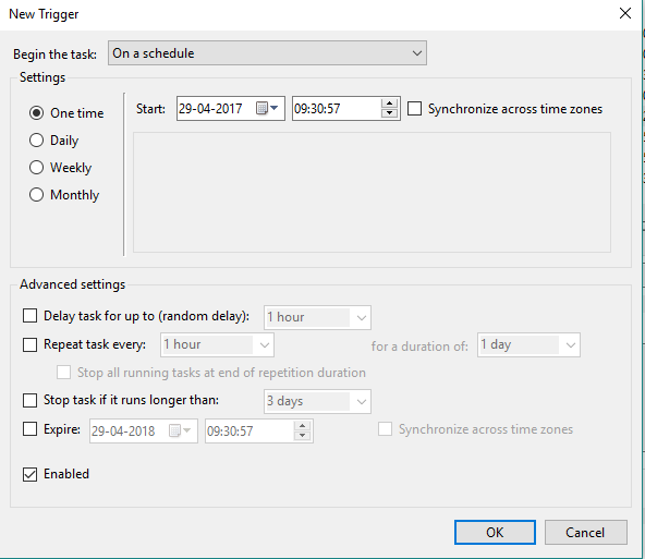 • Choose the periodicity of your task. The Enabled check box is set to checked by default. Click OK to set the trigger.