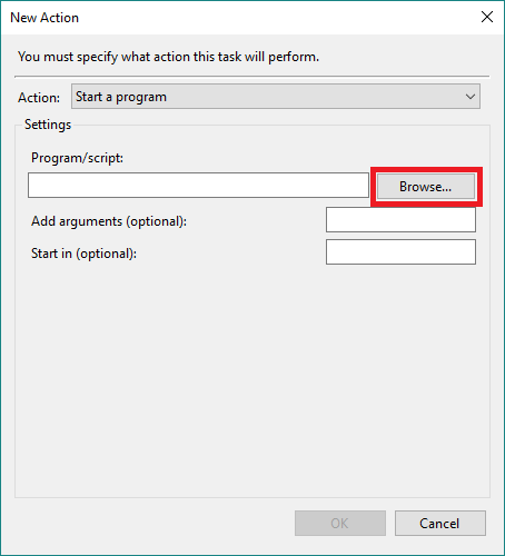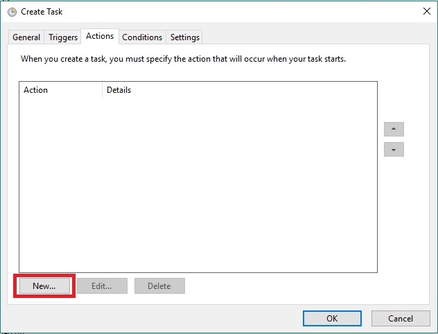 • Switch to Actions tab. Here you will specify the script to be run. Click on New button to add an action.